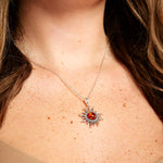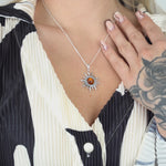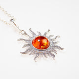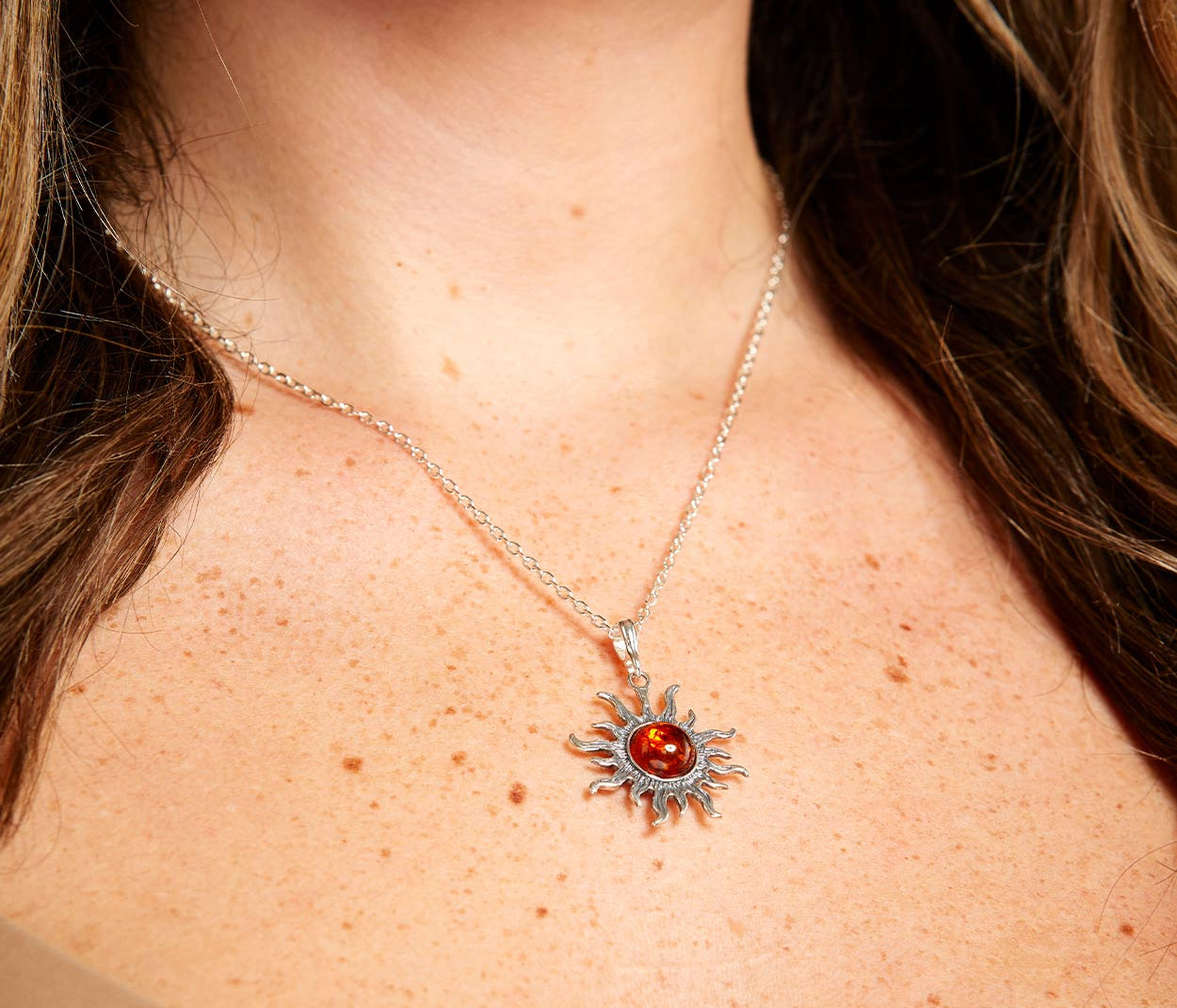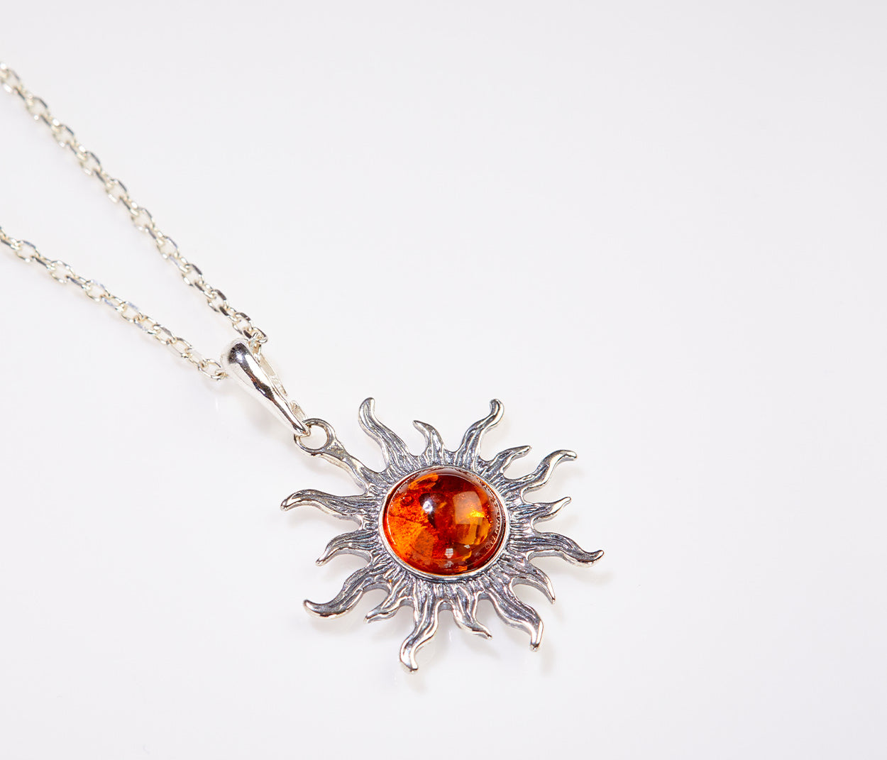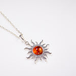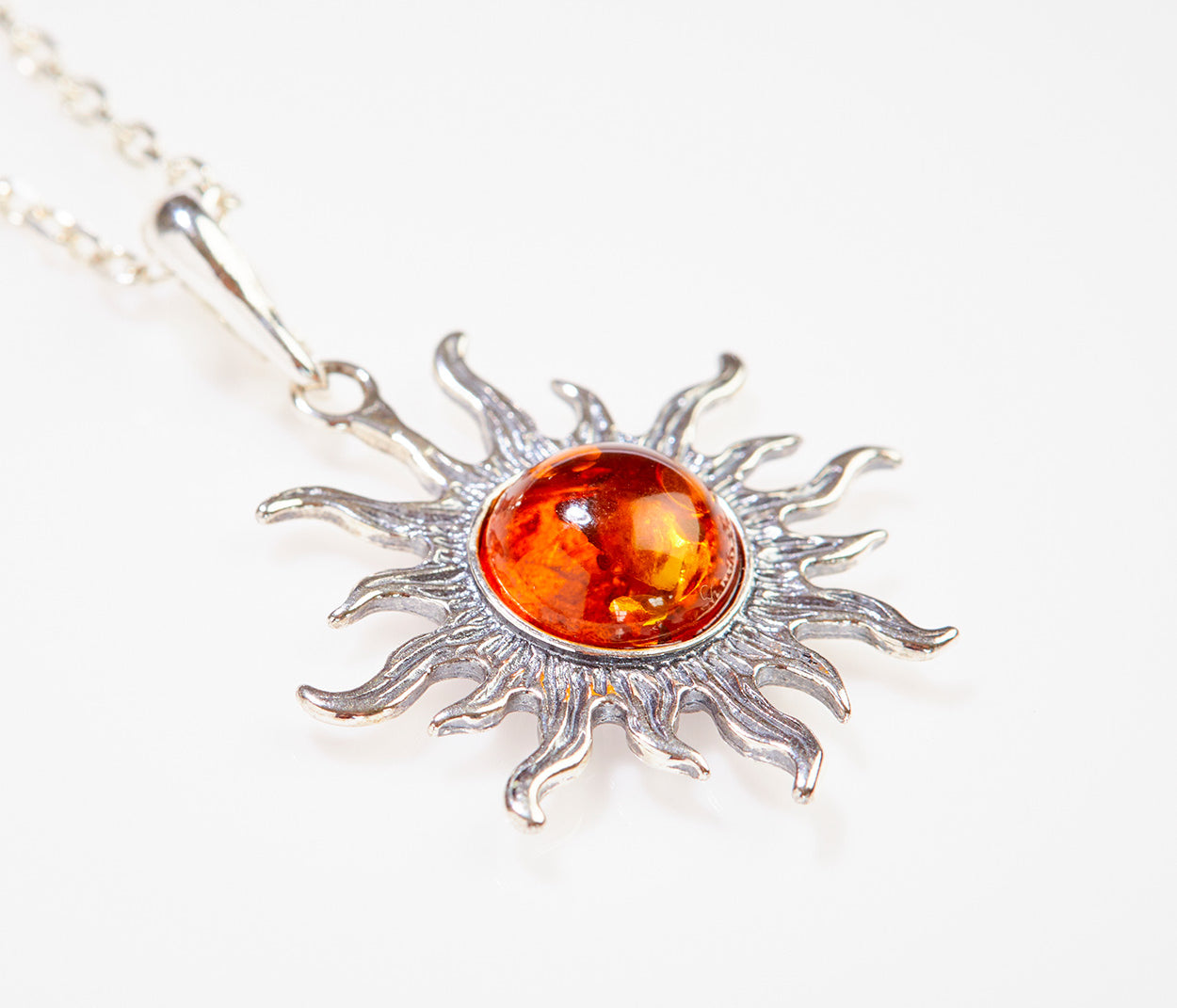 This sun charm pendant has been made with incredible attention to detail. The sterling silver rays are carefully shaped with very intricate surface detail. The amber centrepiece is rounded-off at the top and flat on the reverse - meaning that it catches the light offering a deep fiery cognac colour.