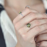 A beautiful Green Amber Ring featuring a 10mm, round Baltic Amber Stone set within a subtle sterling silver bezel. Available in sizes UK J-S.