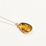 A captivating pendant that radiates natural beauty and quiet elegance. Featuring a rich green amber teardrop encased in a smooth sterling silver frame, Forest Echo reveals golden, moss-like patterns reminiscent of sunlight filtering through an ancient woodland. A unique and earthy piece that brings a touch of the forest to your jewellery collection.