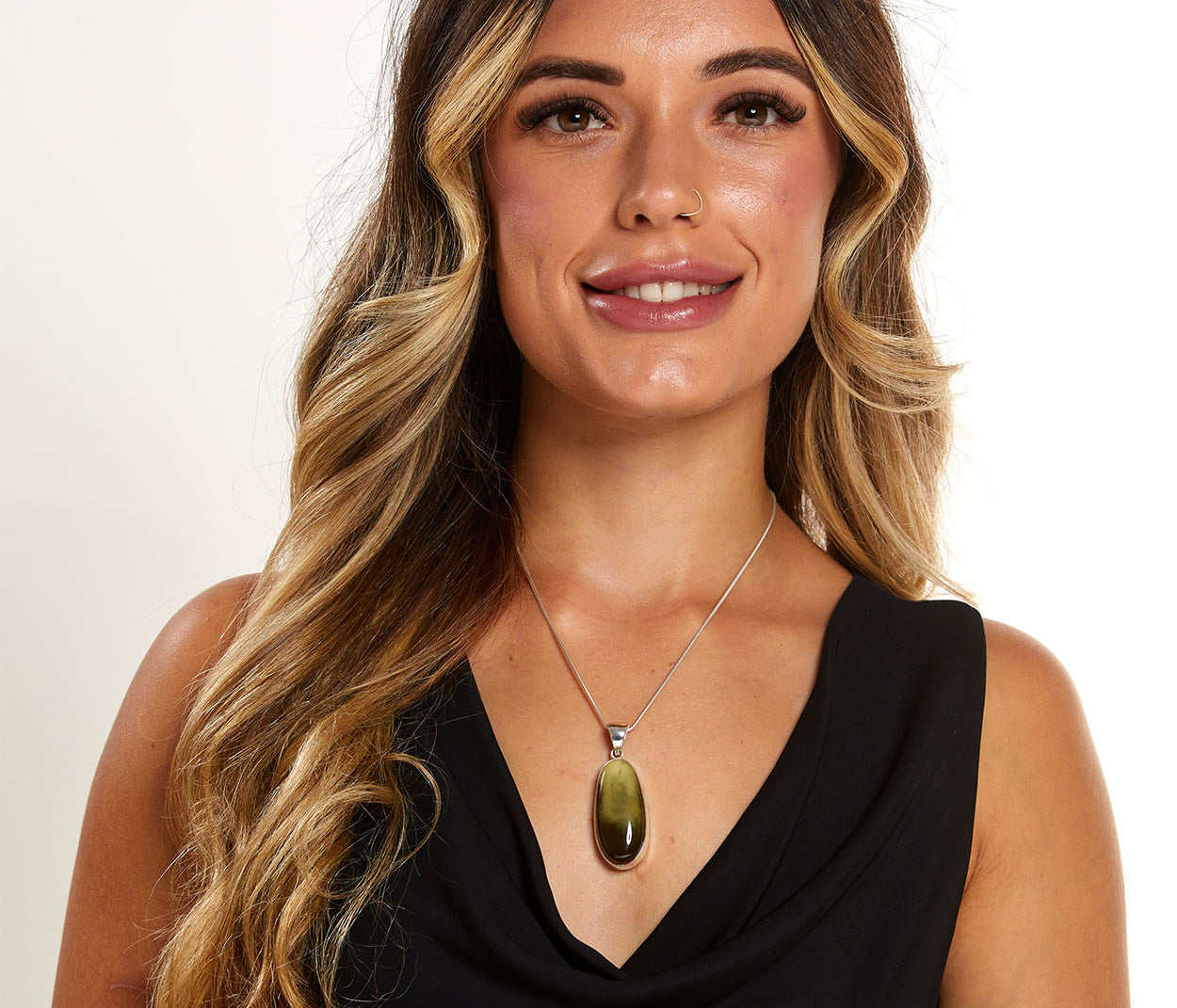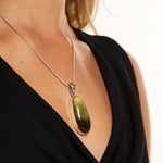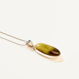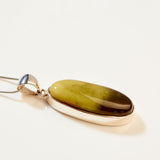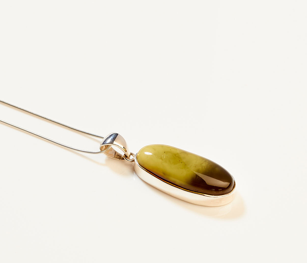 A softly textured pendant inspired by forest stillness and natural transitions. Fernshade Bloom features matte green amber with an ombré gradient, fading from deep woodland green to a soft, leafy glow. Cradled in smooth sterling silver, it’s an understated piece that blossoms with earthy elegance and quiet charm.