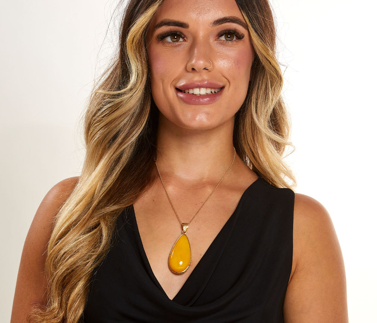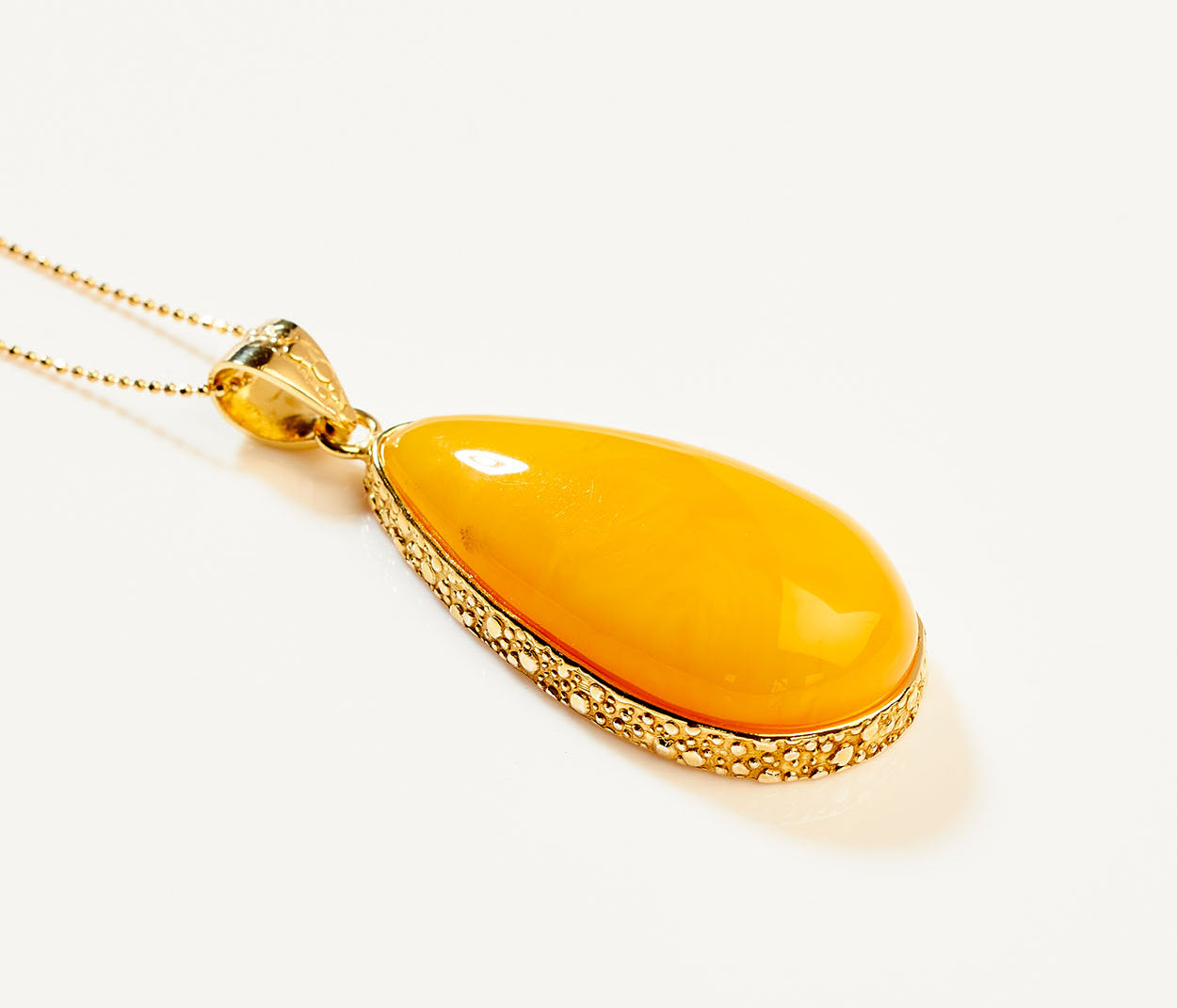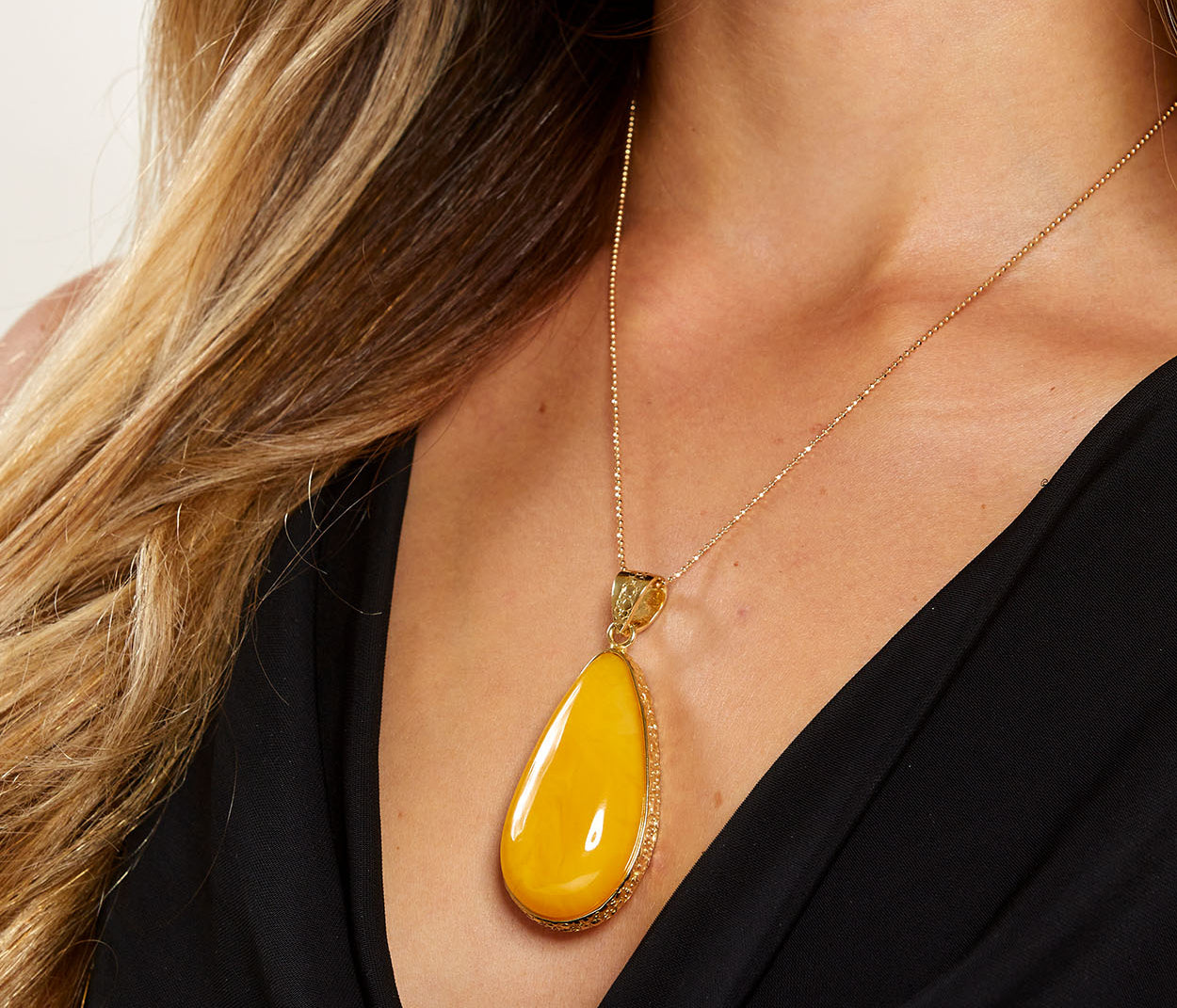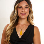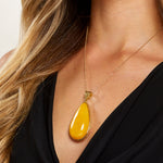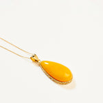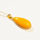 A pendant that glows with fresh, floral warmth. Citrine Bloom features a radiant Baltic amber stone in shades of lemon and soft gold, marbled like sunlight through petals. Cradled in polished gold plated sterling silver, its delicate hues and organic shape evoke the gentle unfolding of a flower in morning light - a graceful, luminous piece that captures the essence of golden growth and quiet beauty.
