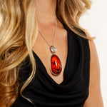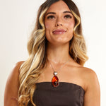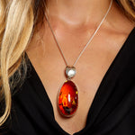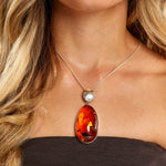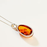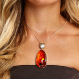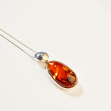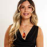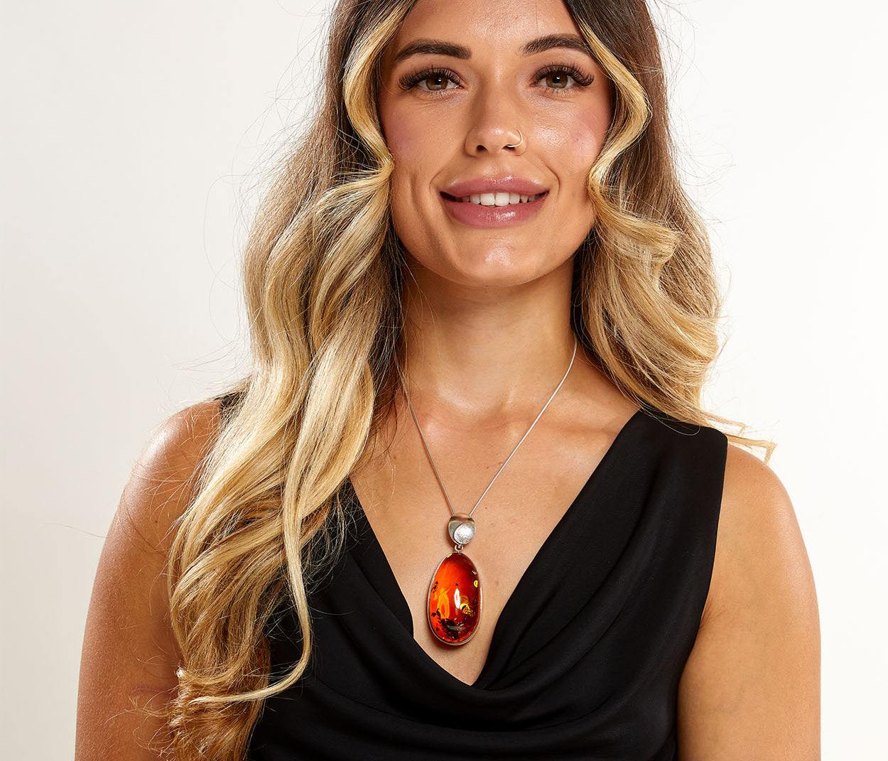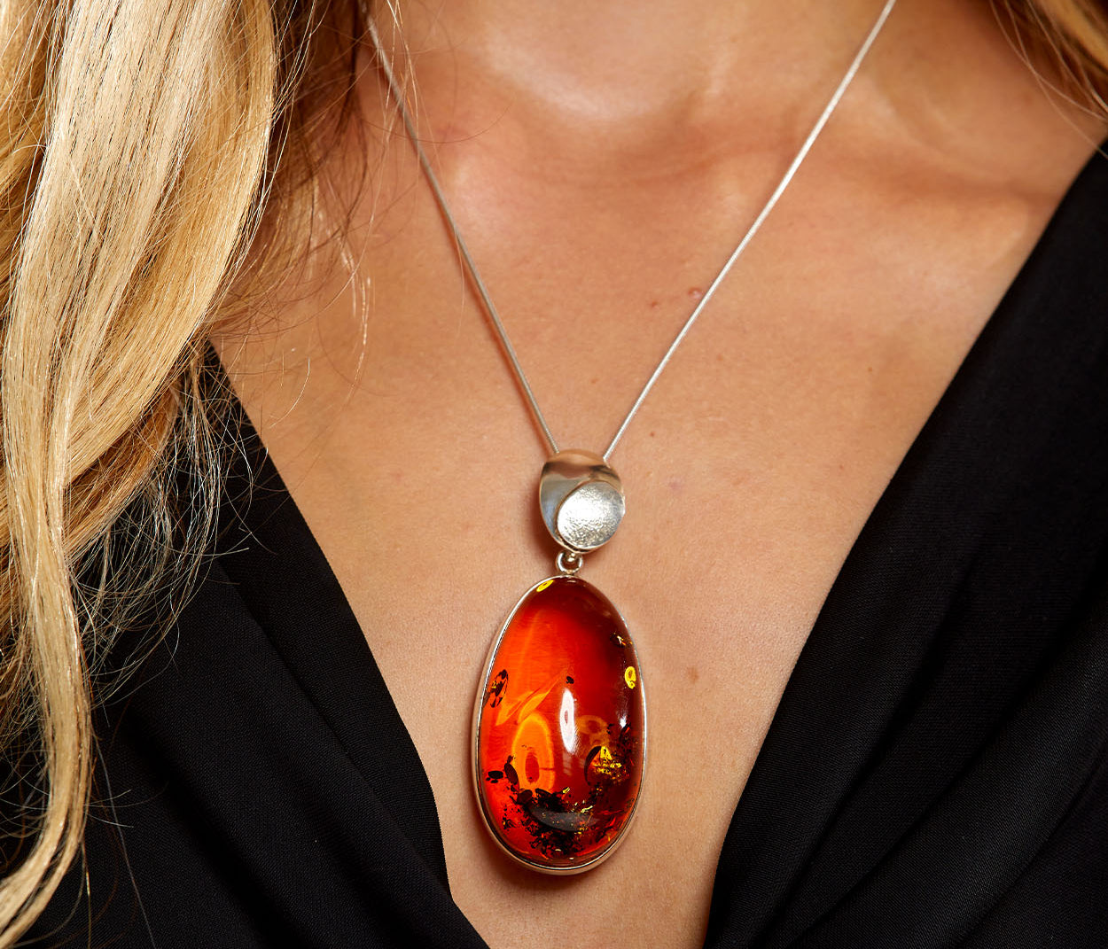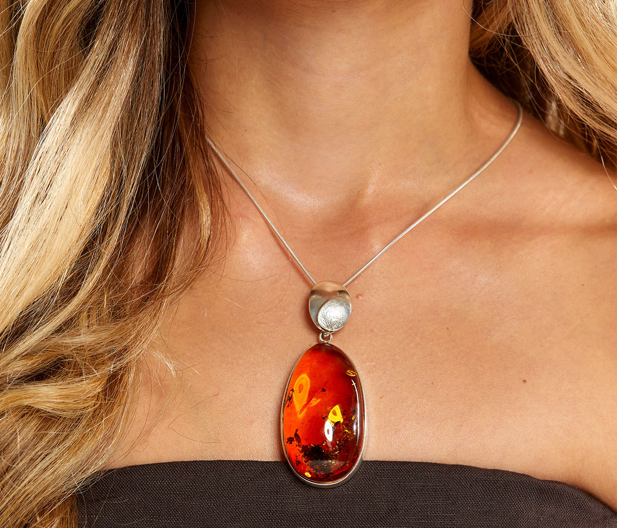 A radiant pendant that captures the first light of day. Amber Dawn showcases a unique piece of cognac amber, glowing with golden-orange warmth, like sunlight rising over a quiet horizon. Framed in polished sterling silver, its soft curves and luminous depth evoke a sense of calm and renewal - a one-of-a-kind piece filled with natural light and quiet beauty.