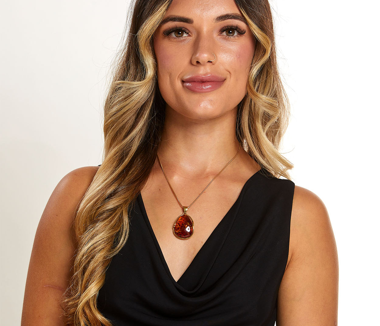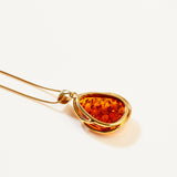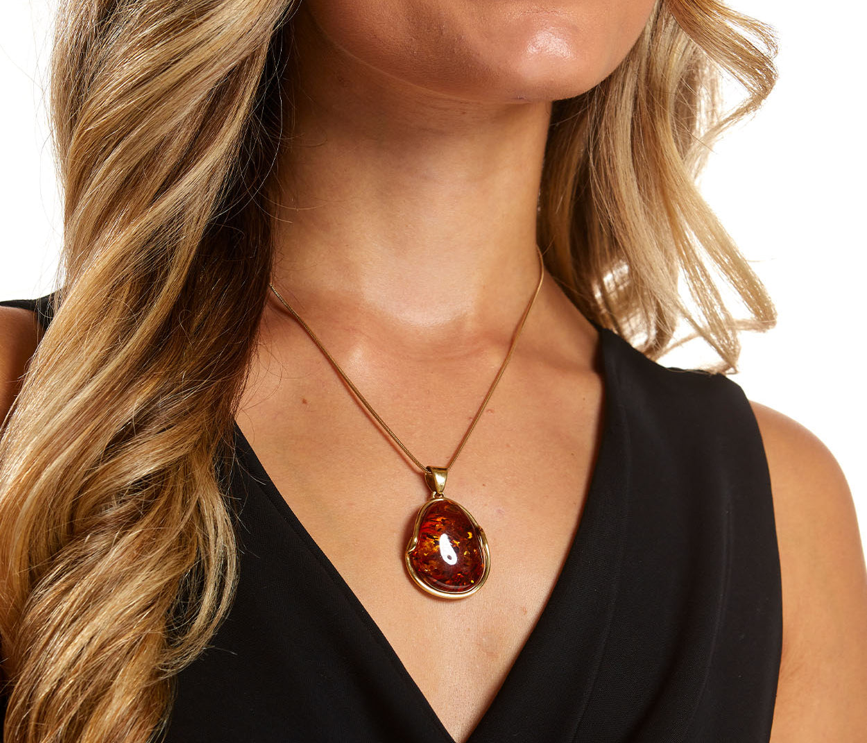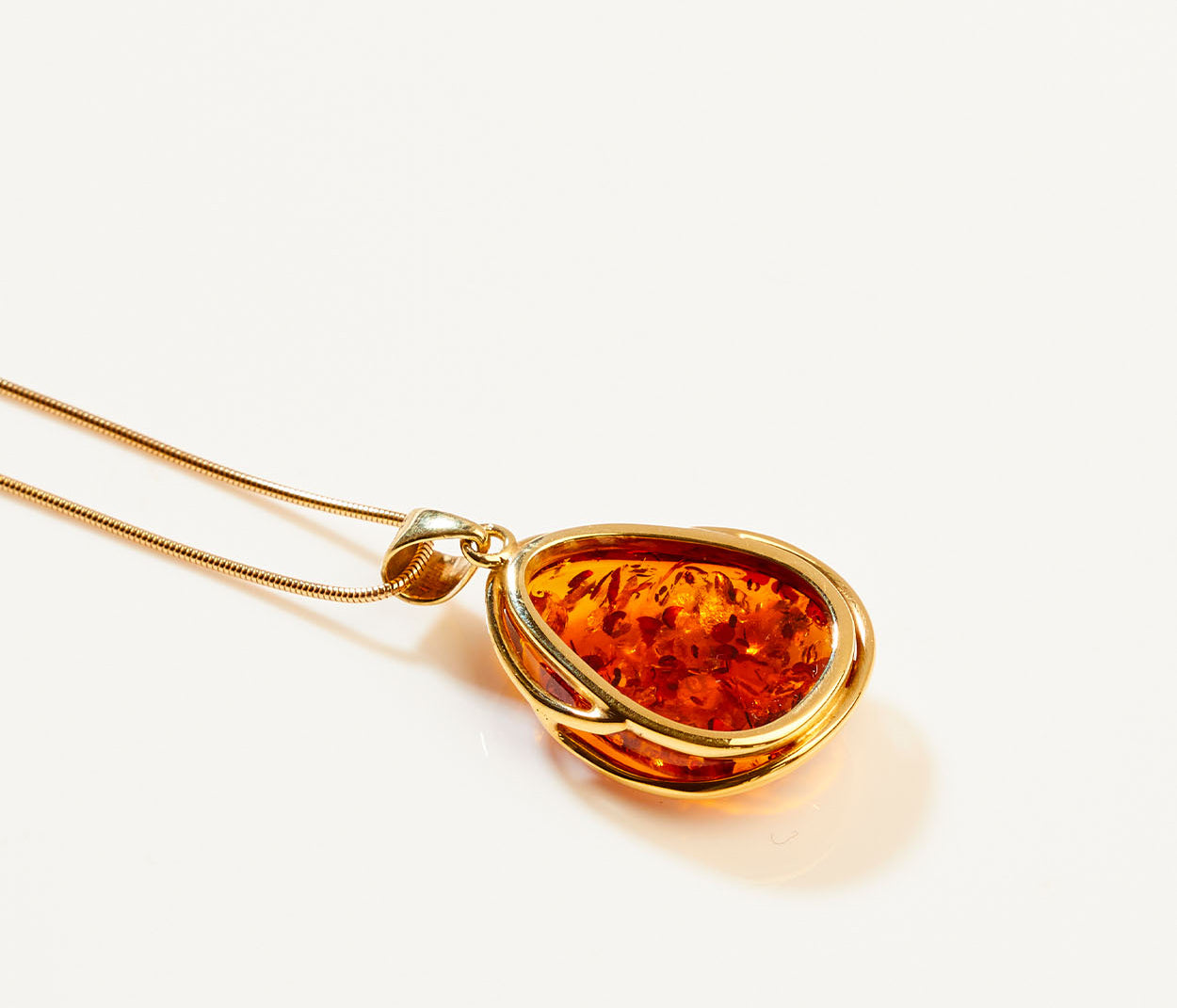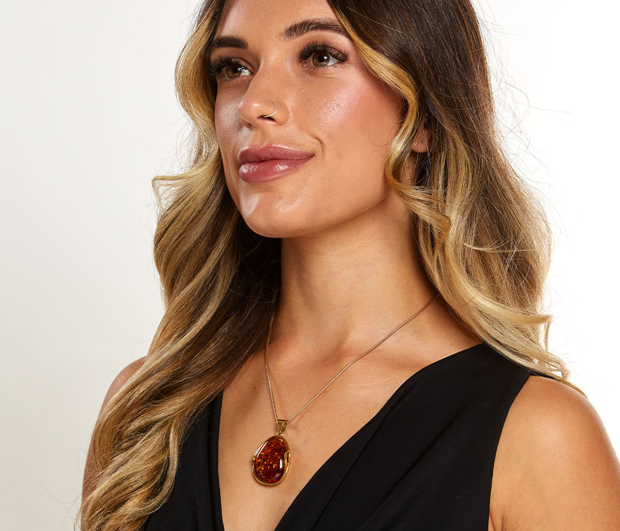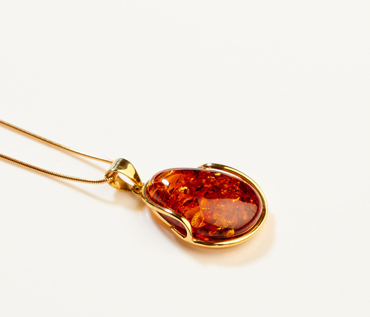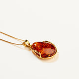A pendant that glows with quiet brilliance. The Golden Aura features a soft, honey-hued Baltic amber stone, radiating a gentle, sunlit warmth. Cradled in polished gold plated sterling silver, its elegant form captures the essence of light and serenity - a graceful piece that surrounds you with a natural, golden glow.