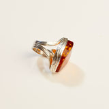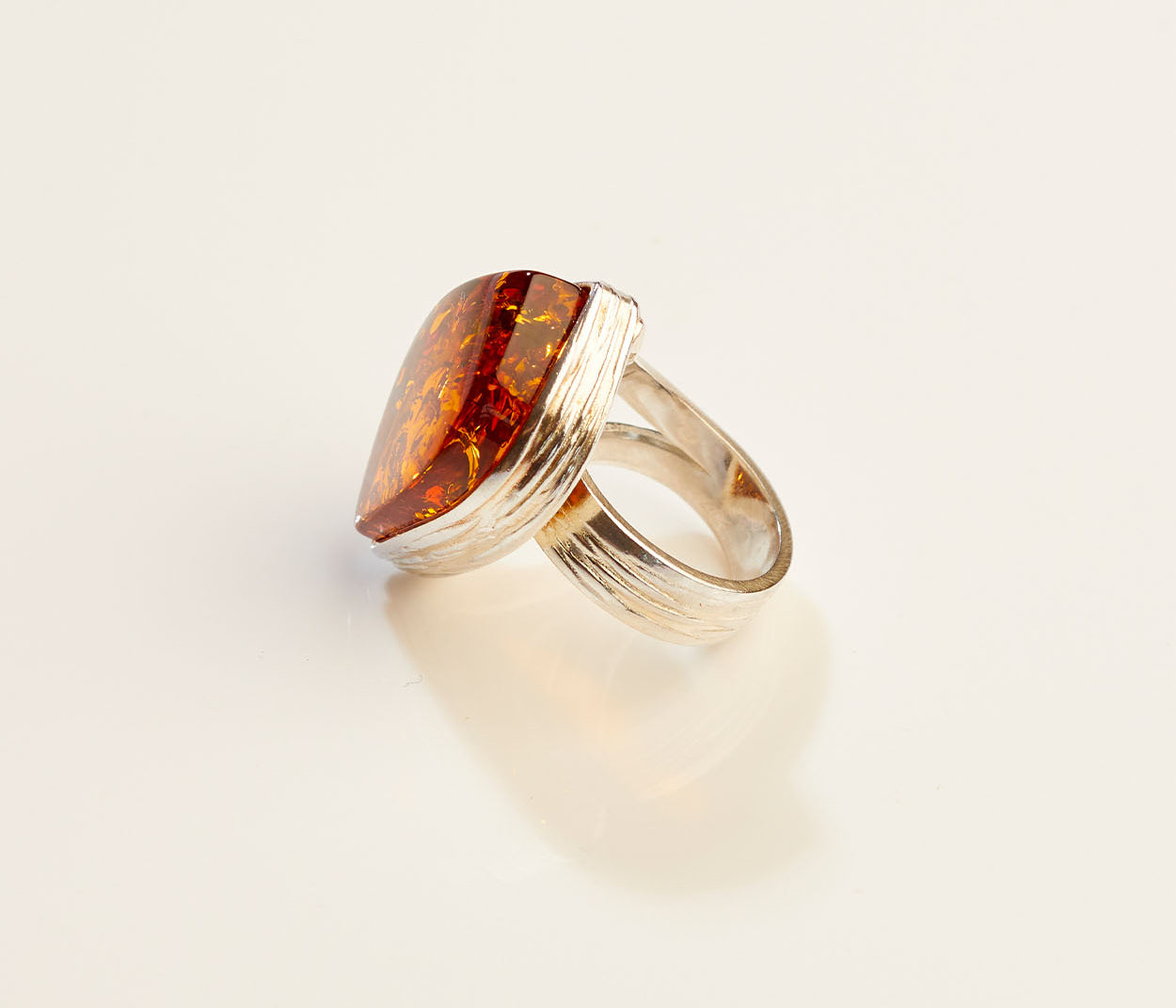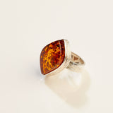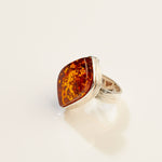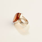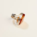 A warm, sculptural beauty with a golden heart. Roselle Glow features an abstract diamond-shaped piece of cognac amber, glowing with rich honeyed tones and natural depth. Set on a textured sterling silver band, the design balances bold form with soft elegance. Feminine and radiant, this one-of-a-kind piece evokes the gentle warmth of autumn light and blooming grace.